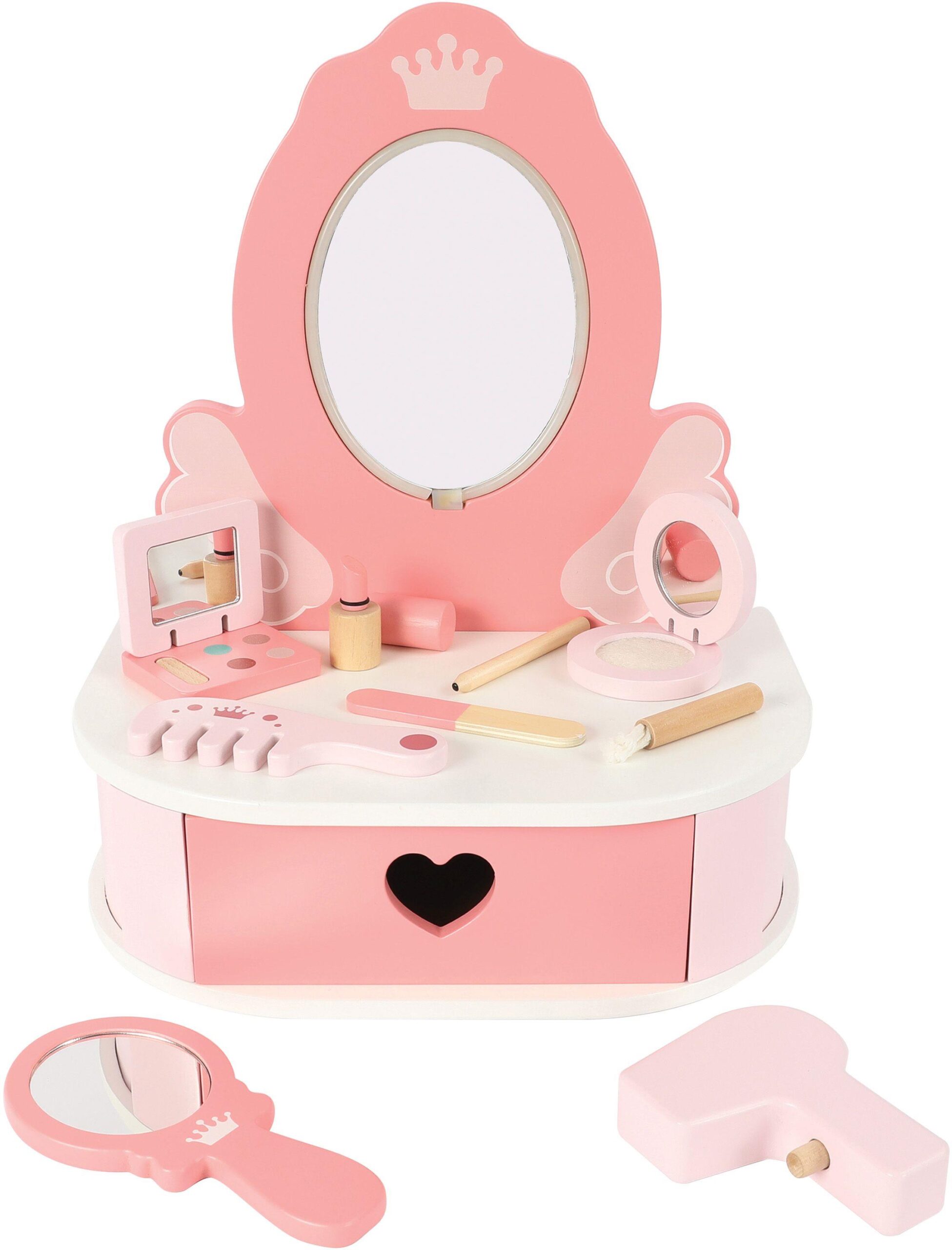 Der Amia Beauty Salon mit Licht und reichlich Zubehör, lädt zum täglichen Frisieren ein. Mit dabei sind ein Handspiegel, Fön, Kamm, Pinsel, Lippenstift, Nagelpfeile, Kajal und Puderdose und eine kleine Box mit aufgemalter Schminkpalette. Alle Utensilien sind aus Holz. Es werden 3xAA Batterien benötigt (nicht inklusive) Maße ca. 30x20x36 cm. Für Kinder ab 3 Jahren.