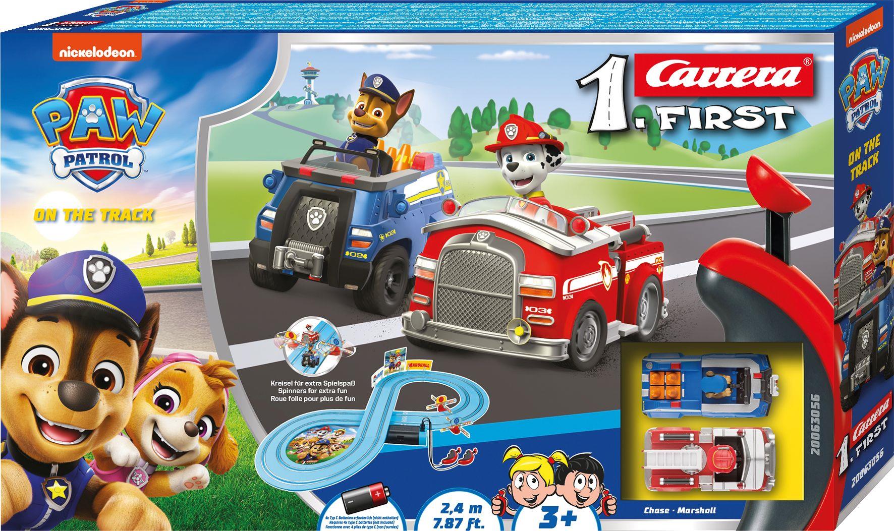 PAW Patrol Carrera Bahn mit Chase und MarshallPAW PAtrol Carrera FIRSTKreisel für extra Spi elspaßcoole Streckendekoration mit offizieller PAW Patrol LizenzAb 3 Jahren Deine Freunde und Helfer mit vier Pfoten – jetzt auch auf der Rennbahn!Begib dich mit deinen vierbeinig en Freunden auf die Carrera Bahn der PAW Patrol. Erlebe die aufregende Welt der PAW Patrol und lasse dich vom Rennfieber packen! Die Fellnasen der PAW Patrol sind in der Kinderserie gefeierte Helden. Sie sind immer zur Stelle, wenn es darum geht, Menschen in Not zu helfen, Probleme zu lösen ode r alltägliche Angelegenheiten zu meistern. Jedes Mitglied der PAW Patrol hat nicht nur seinen e inzigartigen Charakter, sondern auch ein individuelles Fortbewegungsmittel – und was wäre da pa ssender als ein Rennen? Wer ist schneller zur Stelle, wenn es brenzlig wird?Jetzt stellt sich nur noch die Frage: Wer von den mutigen Hunden wird der Gewinner sein? Finde es heraus, indem d u den tollpatschigen Dalmatiner Marshall mit seinem Feuerwehrauto gegen den sportlichen Schäfer hund Chase mit seinem Polizeiwagen antreten lässt. Die beiden Slotcars im Maßstab 1:50 li efern sich auf der 2,4 Meter langen PAW Patrol Carrera Bahn ein actiongeladenes Duell und flitzen da bei an typischer Streckendekoration vorbei – einfach richtig cool!Jedes Kart mit den niedlichen Hündchen muss auf der Strecke pro Runde einen Kreisel durchqueren. Dieser sorgt für einen zu sätzlichen Spaßfaktor und lässt die Spannung steigen. Dank der offiziellen PAW Patro l-Lizenz erstrahlt das Carrera FIRST Set in einem tollen Design, das jeden kleinen Rennfahrer in die Welt der tapferen Hundeteams eintauchen lässt. Die beiden kinderfreundlichen Handregler geben dir die volle Kontrolle über die Fahrzeuge, und die batteriebetriebenen Funktionen garantieren eine realistische Rennerfahrung. An die Handregler, fertig, los! Mit den PAW Patrol Carre ra Autos wirst du super viel Spaß haben und deine eigenen Rennabenteuer mit Chase und Marshall erleben. Der tollpatschige Dalmatiner rast mit seinem Feuerwehrauto los, wenn er zum Einsatz fä hrt. Während der sportliche Schäferhund mit seinem Polizeiauto die Verfolgung aufnimmt. Also, nichts wie los – schnapp dir die Paw Patrol Carrera Bahn und lass die Hunde los! Falls du noch mehr über deine Helden der PAW Patrol erfahren möchtest, schaue dich einfach in unserer u mfangreichen PAW Patrol Themenwelt um!