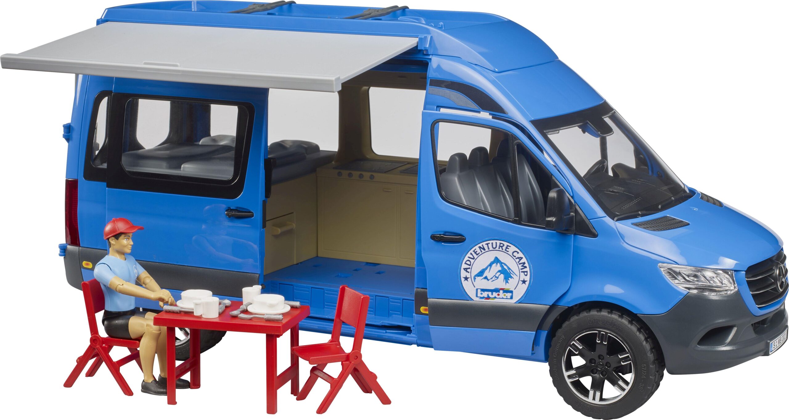 Camping liegt auch in 2025 absolut im Trend. Dieses spannende Freizeitthema können kleine Nachwuchs Camper auch bei BRUDER erleben. Der neue MB Sprinter ist auch als Basis Modell für Wohnmobile überaus erfolgreich. Die Version des neuen MB Sprinter Camper von BRUDER besticht durch seinen Detailreichtum, einer modernen Farbgebung und seine Vielseitigkeit. Das Fahrzeug verfügt über Türen zum Öffnen an Fahrerkabine und Heck. Hier hat die mitgelieferte bworld Figur Zugang zum integrierten Doppelbett und großem Stau-Fach. Besonderes Highlight ist die neu entwickelte Schiebetüre an der Beifahrerseite über die man die Küchenzeile erreichen kann. Für sonnige Tage besitzt das Wohnmobil eine ausziehbare Markise sowie stilechte Campingmöbel und Geschirr. Tolle Erweiterungen für den Camper sind das bworld Kajak (Art.- Nr. 63155), welches sich auf dem Dach transportieren lässt, oder das Motorrad Ducati Deser Sled (Art.-Nr. 63051)