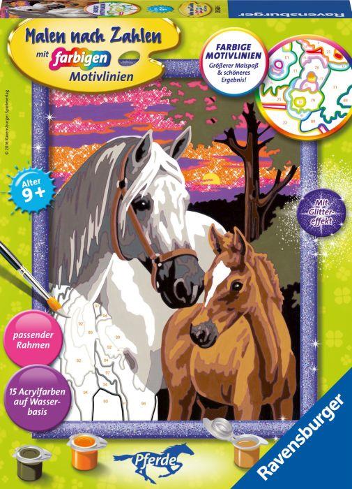 Farbige Motivlinien: Größerer Malspaß & ein schöneres Ergebnis!Dank der farbigen Motivlinien, können die Kinder das ganze Motiv Pferde im Sonnenuntergang und die Farben schneller erkennen. Der Pinsel hat eine gute Führung und so entsteht nach und nach ein perfektes Bild.Die schönen Motive zum Ausmalen sind eine tolle Geschenkidee für Kinder ab 9 Jahren und eine schöne Dekoration für das Kinderzimmer. In diesem Malset sind bereits 15 fertig gemischte Acrylfarben enthalten.Mit Malen nach Zahlen von Ravensburger lernen die Kinder Flächen sorgfältig auszumalen, ihr Maltalent zu verbessern sowie feinmotorische Fähigkeiten zu entwickeln. Am Ende stehen Freude, Stolz und ein Erfolgserlebnis, das die Lust am Weitermalen weckt.Die Motive sind altersgerecht in drei Schwierigkeitsstufen umgesetzt: von einfachen Bildern mit wenigen, großen Malflächen bis hin zu Bildern mit vielen, kleinen Malflächen für Fortgeschrittene.Jedes Malset enthält alles, was Künstler zum Malen brauchen und es ist kein Mischen der Farben notwendig. Zusätzlich zur Maltafel, zu den Farben und zum Pinsel, ist in diesem Malset funkelnder Glitter enthalten. Sobald das Motiv fertig ausgemalt ist, wird der Glitter angemischt und aufgetragen. So entsteht wird das Motiv zum Glitzern gebracht.Das Ravensburger Malen nach Zahlen Programm bietet eine große Motivauswahl für Kinder und Erwachsene.