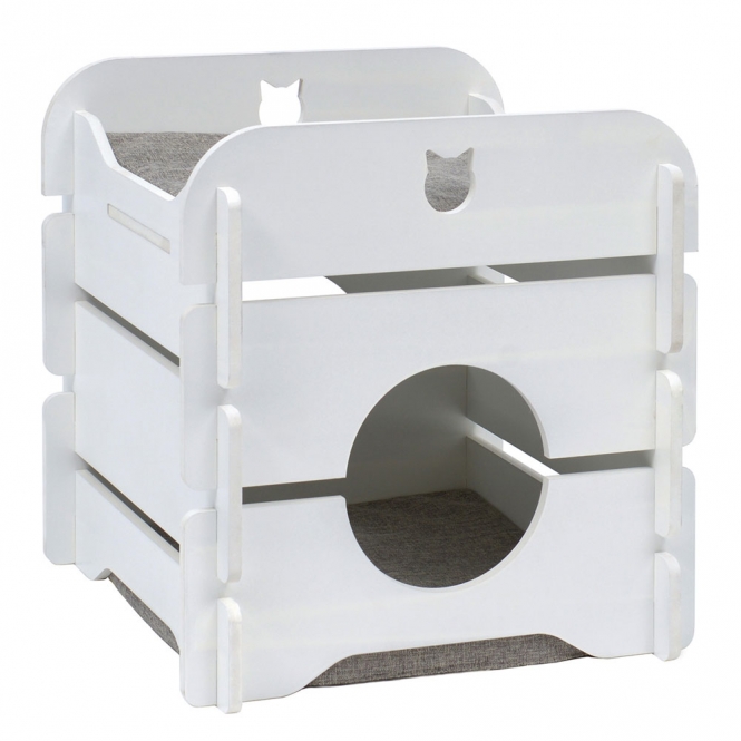 Die Vesper Katzenhöhle Cottage ist ein kubisches Möbelstück für Katzen im romantischen Landhausstil. Es besteht aus einem gemütlichen Versteck unten und einer Aussichtsplattform oben auf dem Möbelstück. Beide Etagen sind mit weichen, gepolsterten Kissen ausgestattet. Darüber hinaus verfügt das Versteck über zwei Eingänge, damit sich Ihre Katze nicht eingeengt fühlt.